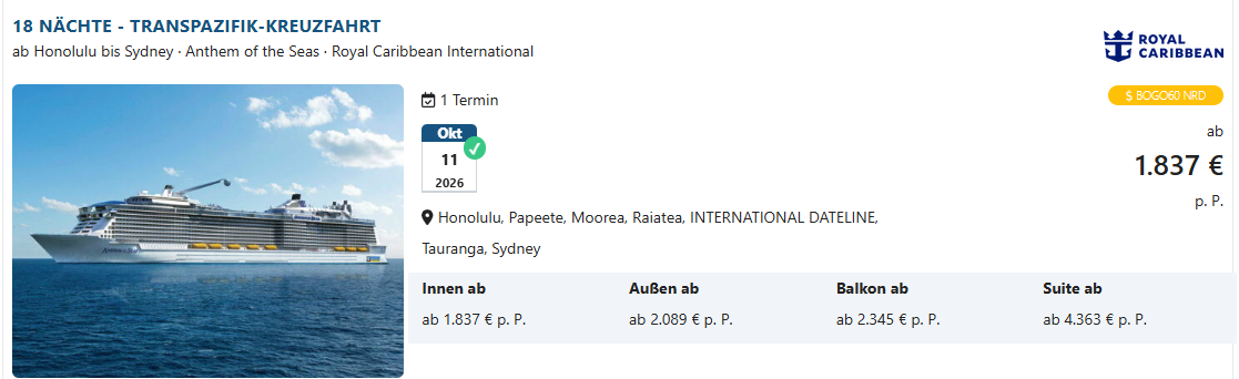 Wie auch immer, ist diese Reise, Transpazifik auch beim Forenbetreiber buchbar. Allerdings kann ich den Teil von LA nach Hawaii nicht finden.