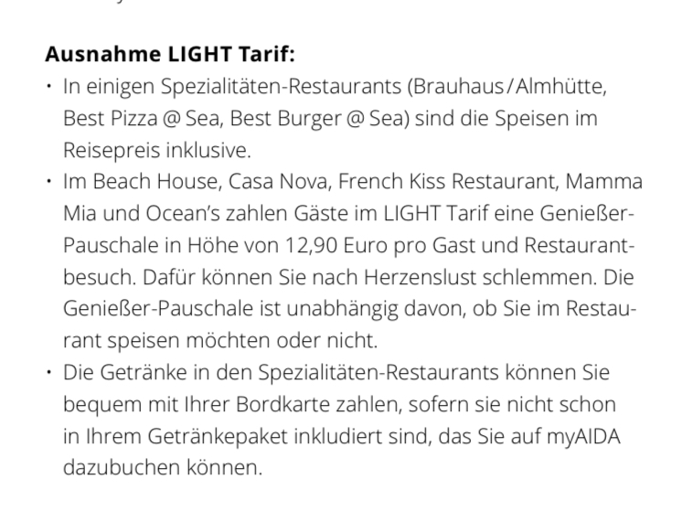 Glaube ich nicht, das ist einfach eine versteckte Preiserhöhung, wenn man die Spezialitätenrestaurants im Light-Tarif besuchen möchte. Auch die entfallenen 250 MB Datenvolumen, die beim Premium entfallen sind letztenendes eine Preissteigerung. Und das Comfort AI kommt mir vor wie die VIP Optionen bei Mein Schiff. Für ne Menge Euronen wird eine mäßige Leisterungssteigerung geboten.
