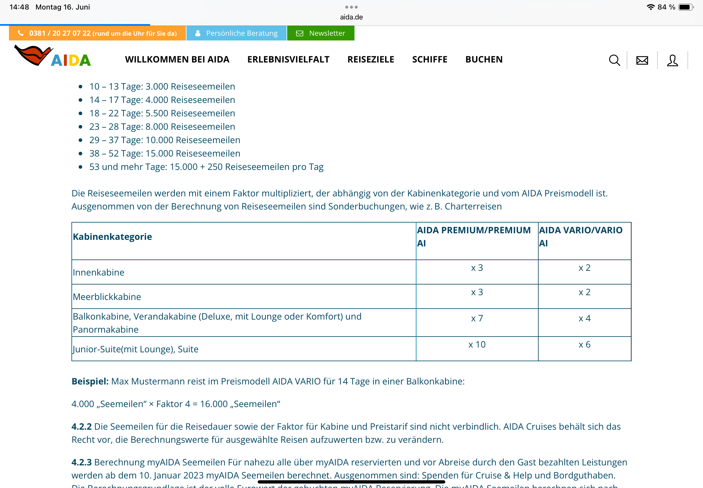 Bei 14 Tagen wären das zusätzliche 4.000 Seemeilen bei Meerblick, 8.000 Seemeilen bei Suite und 12.000 Seemeilen bei Balkon.