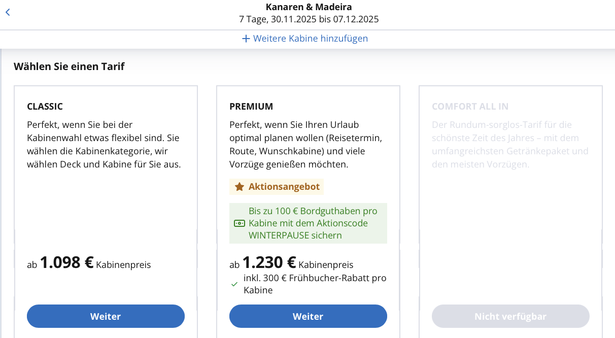 Wir haben premium Meerblick gebucht. Könnten wir auf eine andere Kabinenkategorie oder in AI umbuchen? zB wenn es eine Aktion mit Vergünstigungen gäbe.