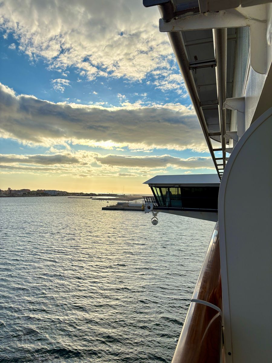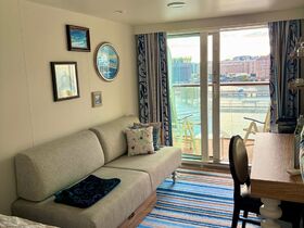 Kategorie A, Nichtraucherbalkon, mit Bettcouche, Backbord vorne, mit Blick auf die Brücke
