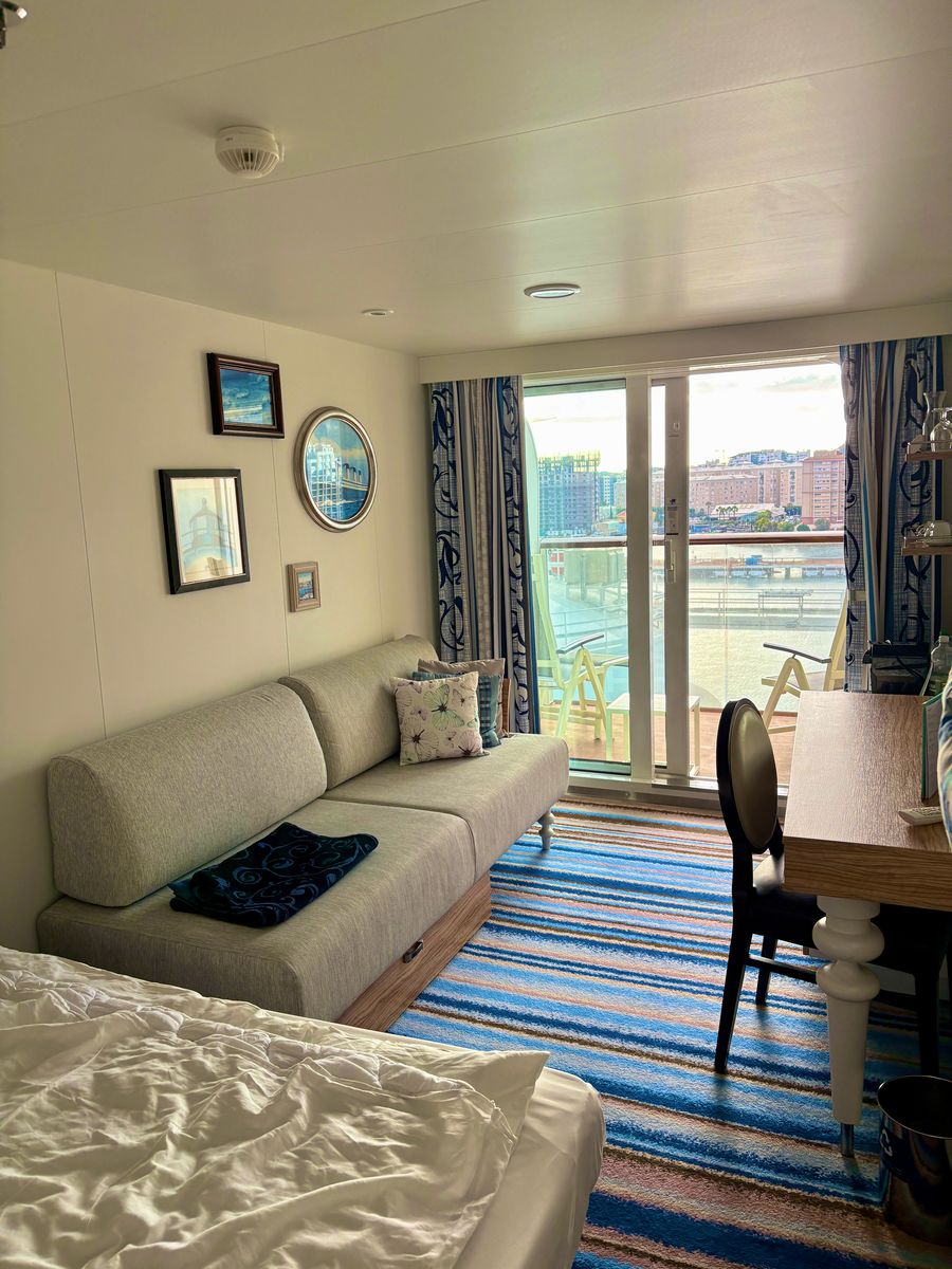 Kategorie A, Nichtraucherbalkon, mit Bettcouche, Backbord vorne, mit Blick auf die Brücke