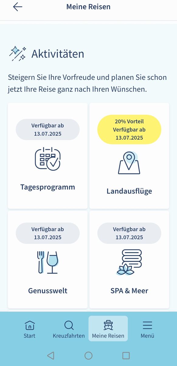 Bei der im Februar 2026 nicht mehr. Da ist die Oberfläche komplett anders gestaltet und der Hinweis fehlt. Landausflüge sollten den Hinweis zum 29.06.2025 für den Buchungsstart haben. Es wird nur noch der 20% Vorteil angezeigt.Der wurde in der letzten Woche mit der „alten“ Oberfläche noch angezeigt. -