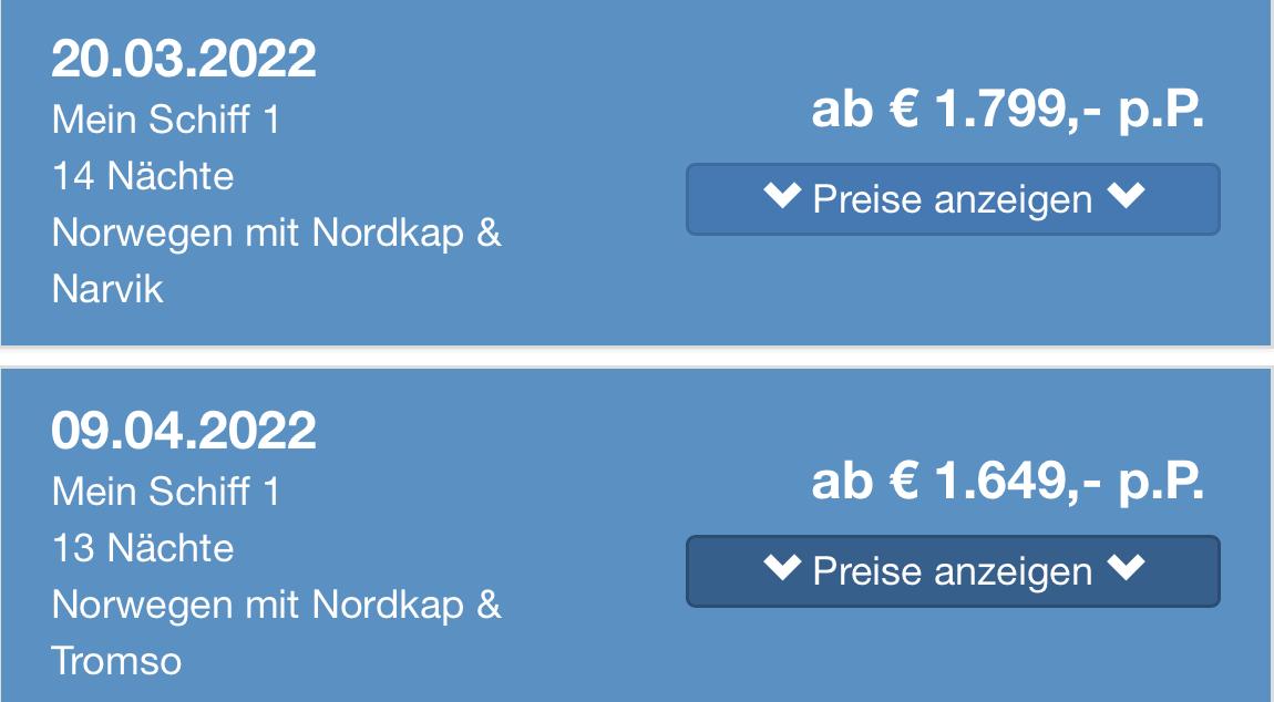 Die Preise sind halt je nach Buchungslage. Die Reise am 20.03 ist um 300€ ggü. des PRO-Preises gesenkt (Innen). Die am 09.04 um 400€. Somit scheint das Interesse am 09.04 geringer zu sein.
