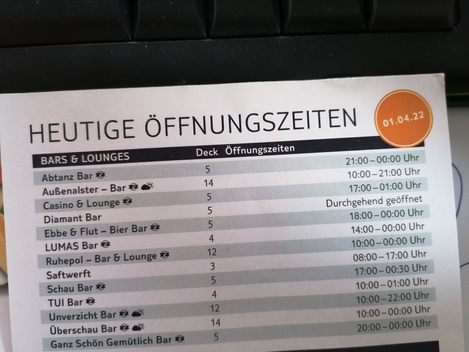 Zumindest werden Öffnungszeiten für die Abtanzbar angegeben in der 1. Zeile. Auf meinen Reisen zu Corona bei TUI war die Abtanzbar nur Fiebermessstation und nicht geöffnet...