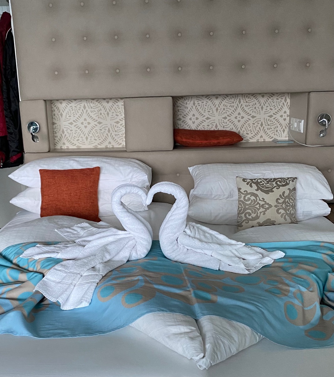 Da gab es Pralinen, Schokolade und Sekt. Das Bett war auch schön dekoriert.