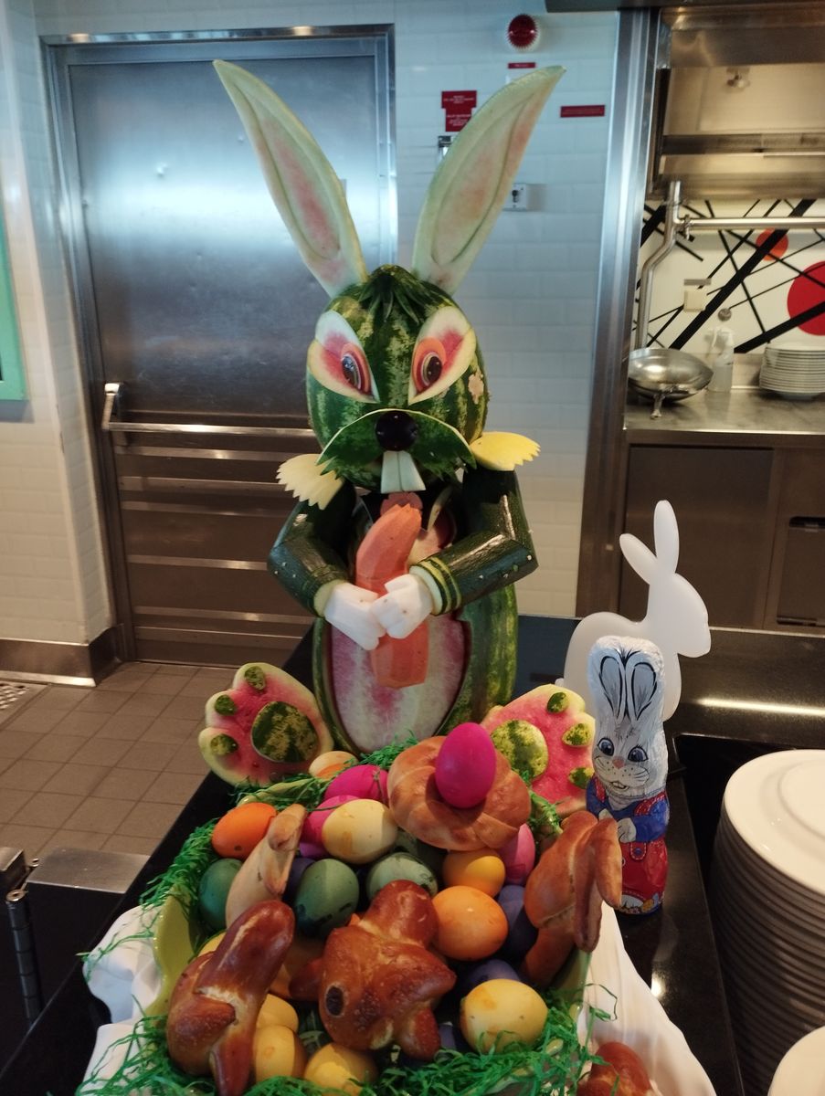 Letzten Karibik Ostern auf der 2, wurde wenig gemacht. War einfach zu warm. Das Essen war generell abends gut. Ostern 21 auf der 4. Azoren nach Madeira, passierte mehr mit Osterhasen!