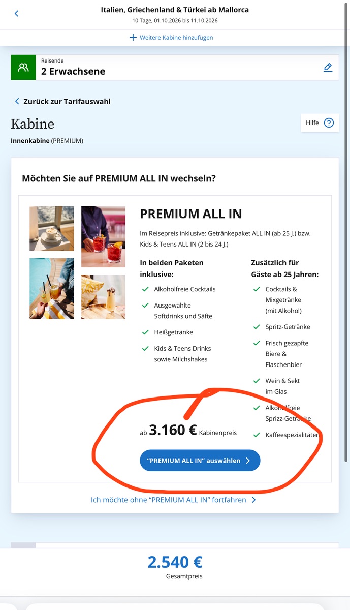 Ich kann aber nirgends vergleichen wenn ich ein Getränkepaket gleich mitbuchen will. Was es kostet![]()