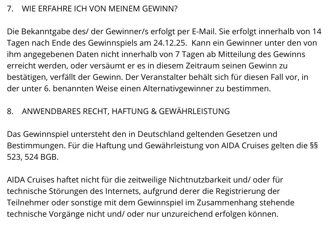 Der Anruf über den Gewinn kam noch kurz vor Weihnachten und dann war komplett Funkstille. Haben dann am Montag auf allen Känalen Aida kontaktiert und dann kam endlich Bewegung in die Sache. Schade, dass nicht mal was auf Anhieb klappen kann, aber der Stress hat sich wenigstens gelohnt.