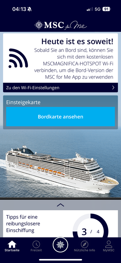 Auf der MSC-me App ist der Countdown verschwunden und mich begrüßte stattdessen diese Ansicht.