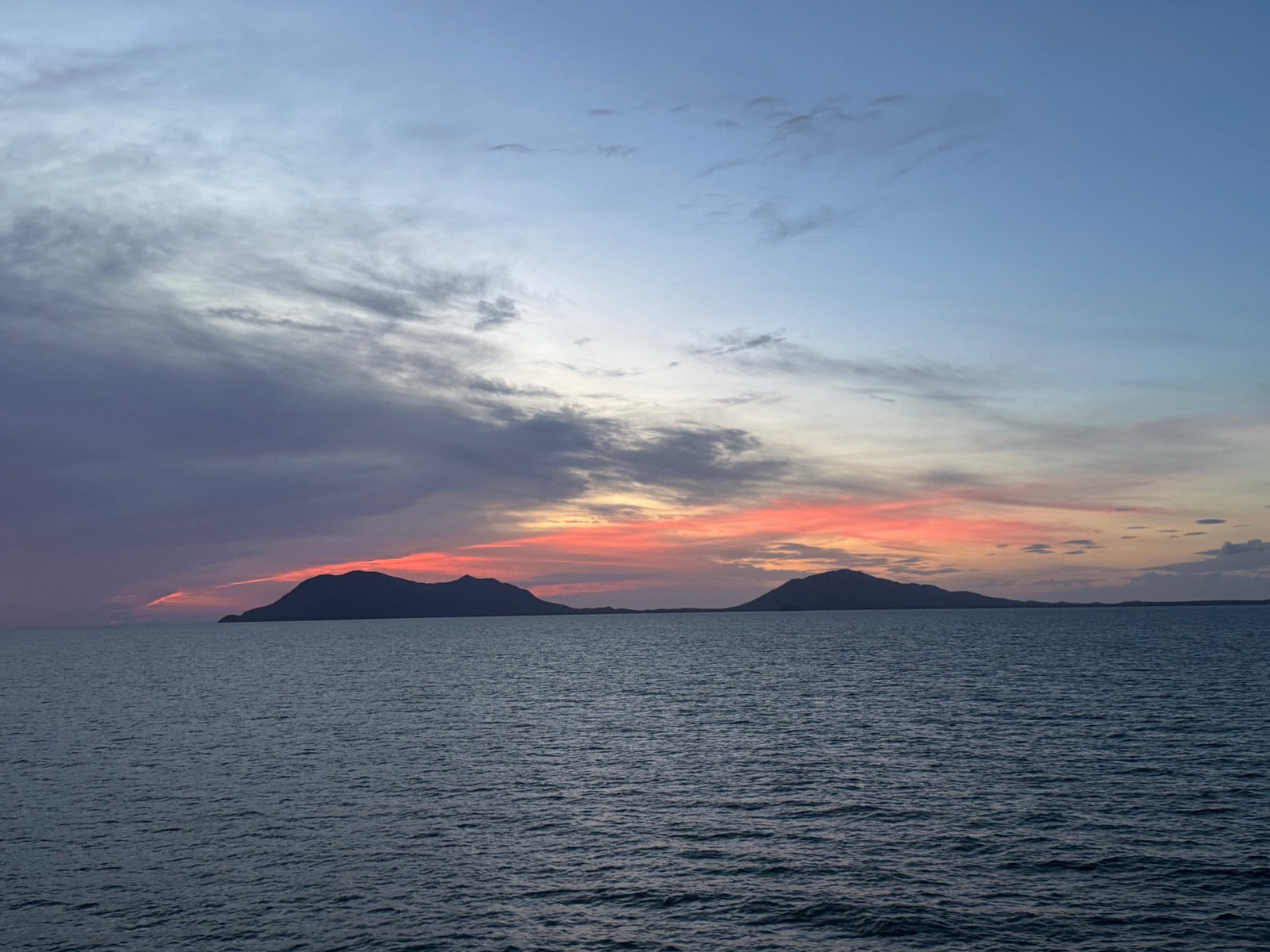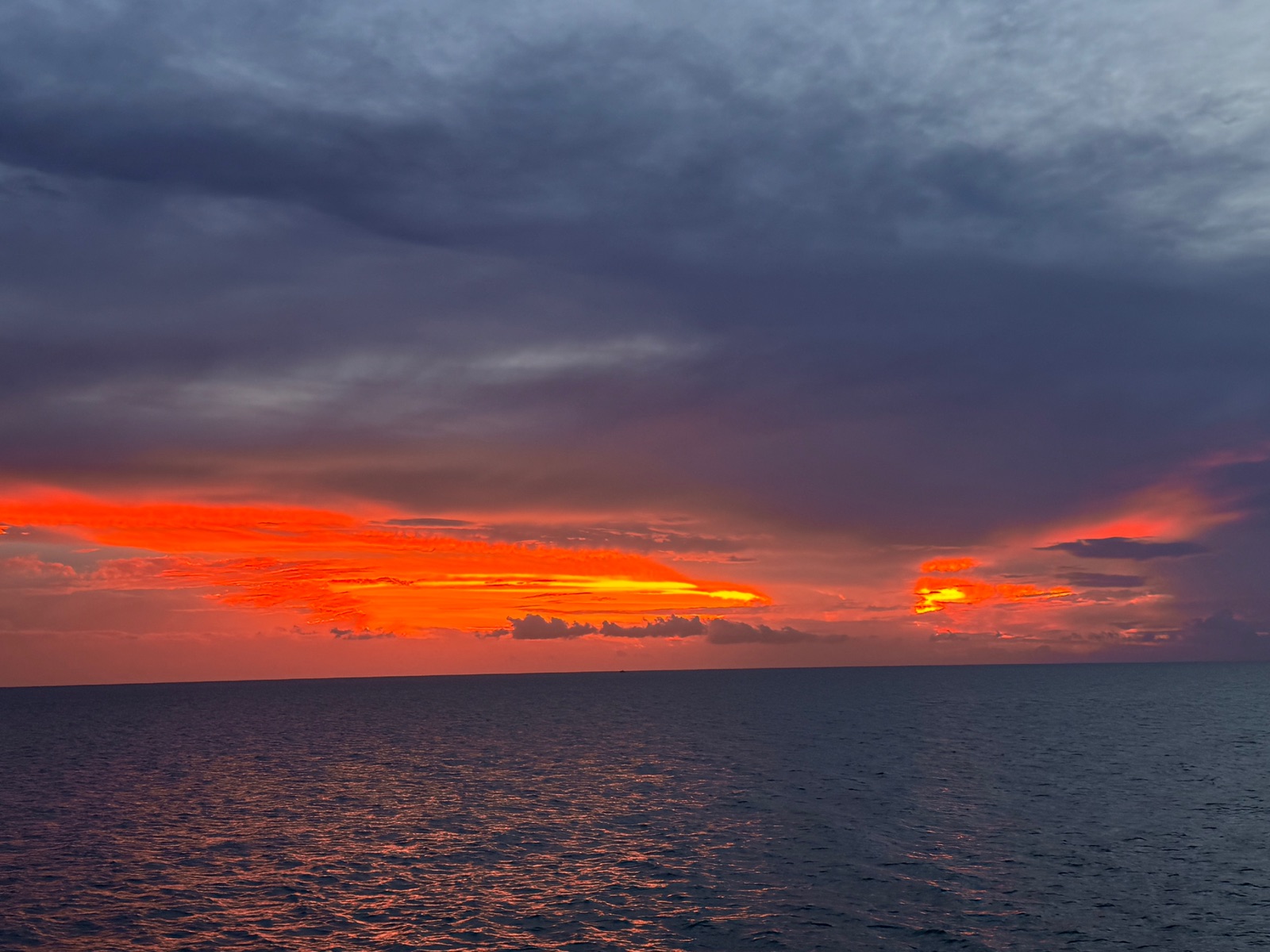 Das Abendrot, welches wir vom Kabinenbalkon noch zwischen Abendessen und Show schnell angeschaut haben, war heute auch wieder ein Farbenspiel sondergleichen.