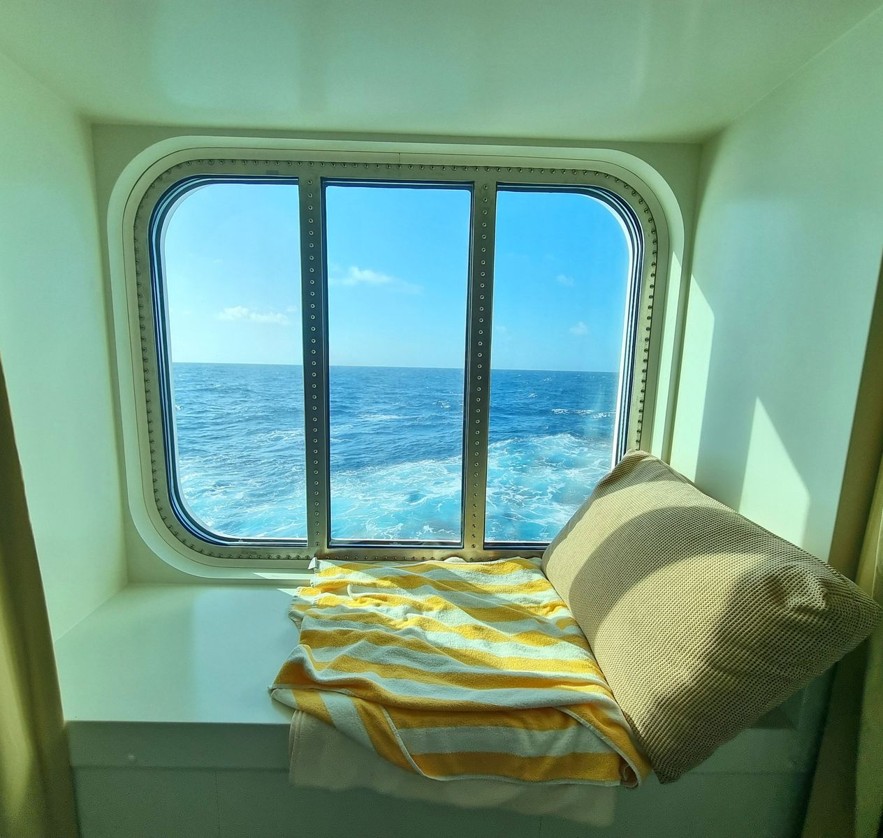 In der kalten Jahreszeit kann man auf den großen Schiffen auch gut eine MeerblickKabine buchen und sich dort in die Fensternische setzen um aufs Meer zu schauen....