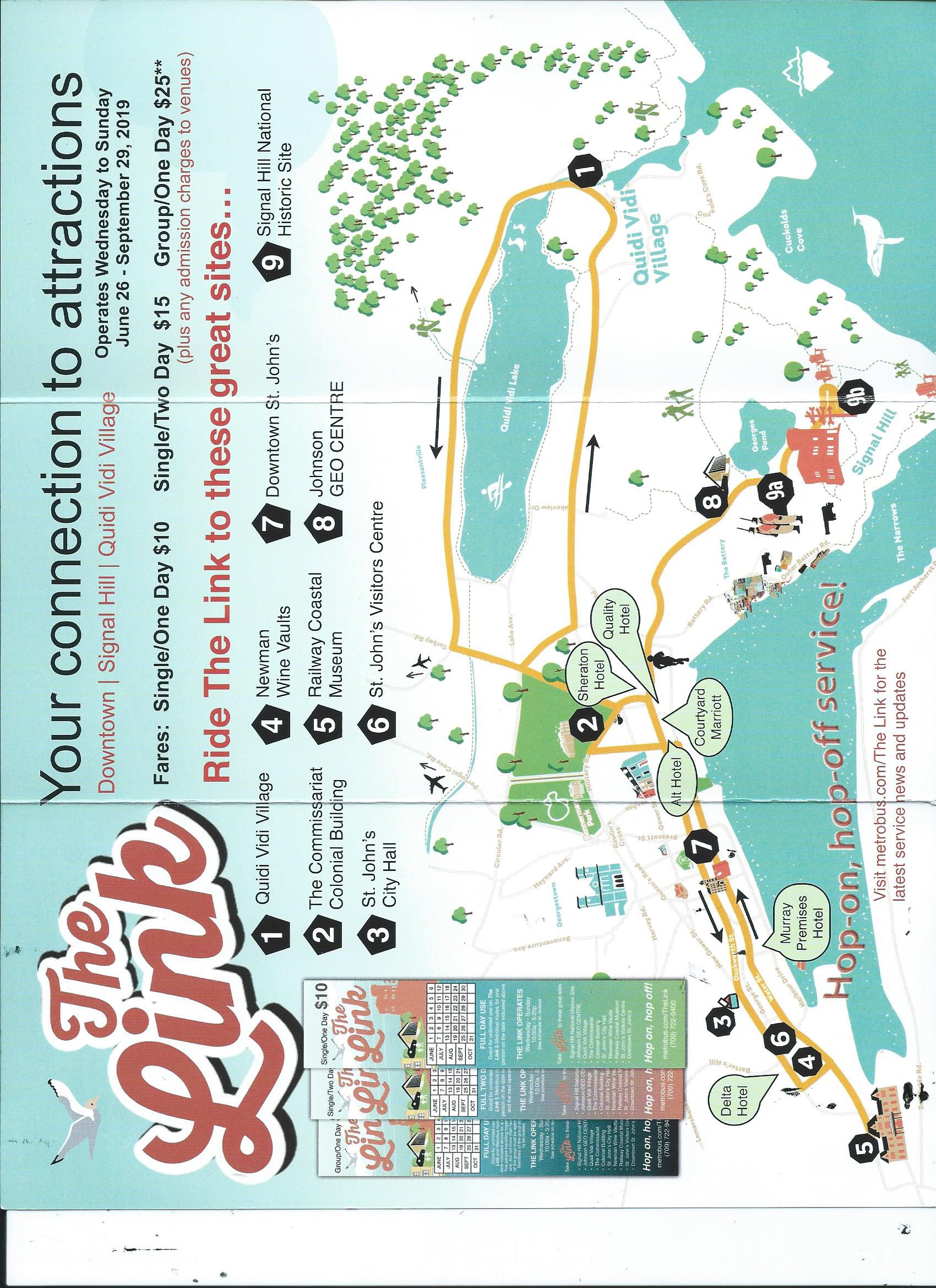 Danke, das mit dem Bus "The Link" hatte ich noch gar nicht gesehen. Passt perfekt, fahren dann damit auf den Hill und dann sehen wir mal weiter, ob wir laufen oder damit wieder zurückfahren. Er kostet 10 CAD (in bar) oder 2,50 Einzelstrecke. Fährt laut Internet von Mittwoch - Sonntags