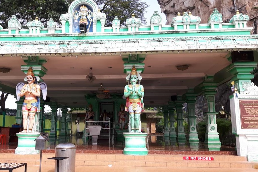 Da wir schon einmal die 272 Stufen emporgestiegen sind, bleiben wir heute wieder im unteren Bereich. Die Tauben flattern über den Vorplatz und die knapp 43 Meter hohe goldene Statue des Gottes Murugans kann man nun wirklich nicht übersehen. Die Figur ist vor einem Jahr noch eingerüstet gewesen, wegen Renovierungsarbeiten. Aber Vorsicht, wer die Stufen hochsteigen will, die Treppe ist wirklich steil und immer mit einem Auge die Affen beobachten, denn die sind diebisch.
