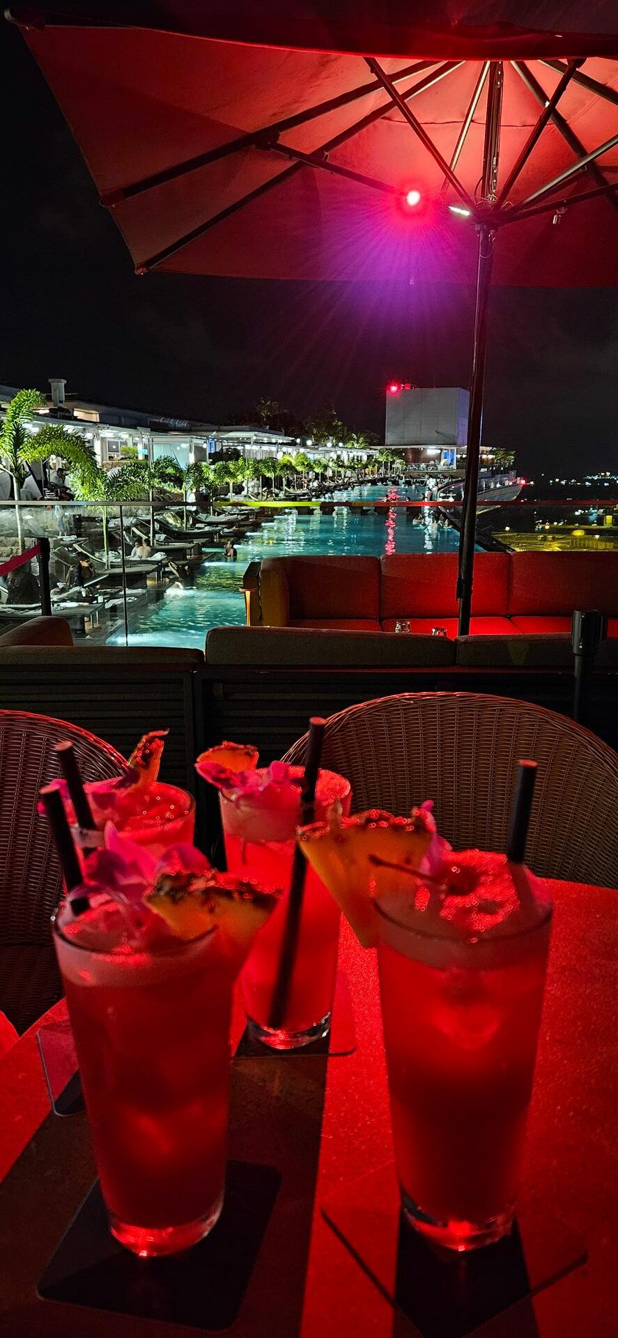 Anschließend liefen wir wieder zur Metro und fuhren ins Marina Bay Sands. Dort besuchten wir die Bar "Cé la Vi" (25 Euro Eintritt/Verzehrgutschein) direkt angrenzend an den Rooftoppool und genossen einen Singapur Sling.