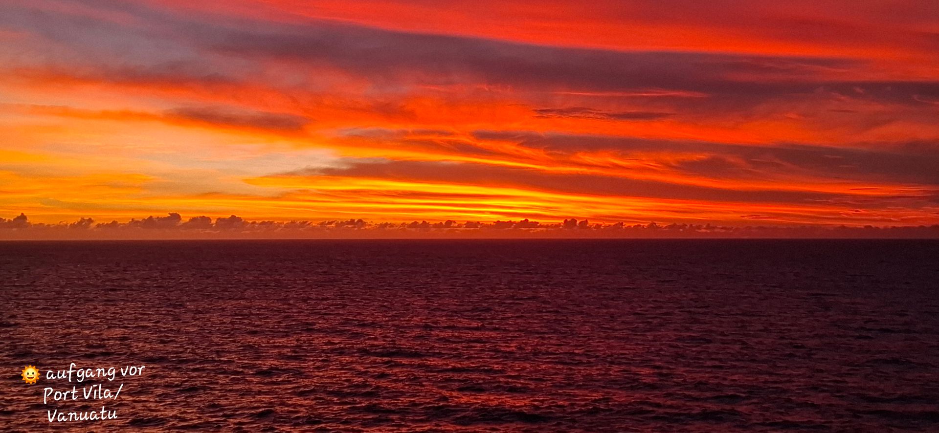 _ zur Info:Derzeit ist es bei uns 10:00h und bei euch 22:00h, morgen überqueren wir die Datumsgrenze dann sind wir um 12:00h voraus( für uns z.b.Do. 07:00h, für euch ist es dann Mi.19:00)
