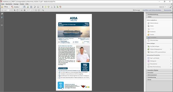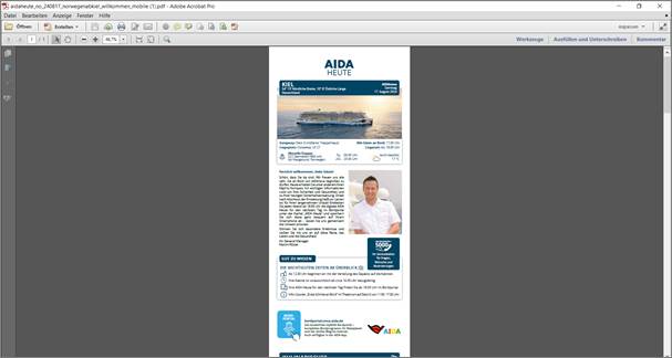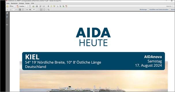 Wer schon einmal versucht hat, im Nachhinein ein Exemplar der an Bord heruntergeladenen „AIDA heute“ zu Hause ausdrucken zu wollen, ist bisher daran gescheitert, denn diese „lange PDF-Schlange“ lässt sich leider nicht in einer lesbaren Form drucken, da alles klitzeklein auf einer Seite erscheint: