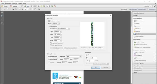 Auf „Werkzeuge“ klicken, damit sich das Menüfenster (bei mir am rechten Bildrand) öffnet, dort auf „Seiten“ gehen und anschließend auf „Zuschneiden“: