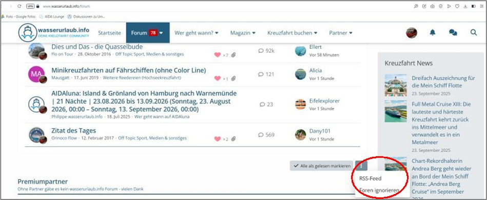 Nunmehr auf eben dieses Feld mit den drei Pünktchen klicken, so dass sich dort eine Art „Unter-Menü“ mit den Auswahlfeldern „RSS Feed“ und „Foren ignorieren“ öffnet, wie in nachfolgendem Screenshot im roten Kreis ersichtlich: