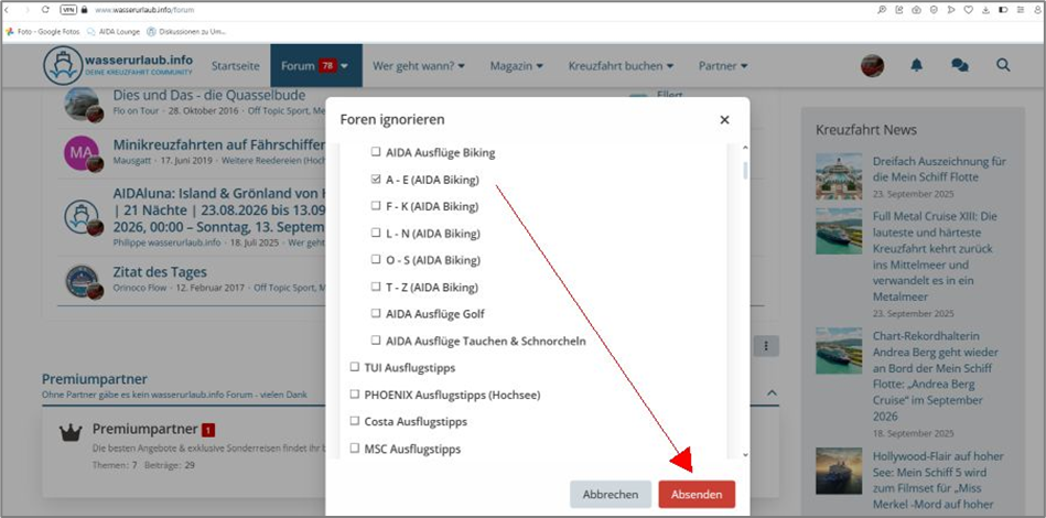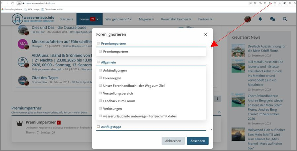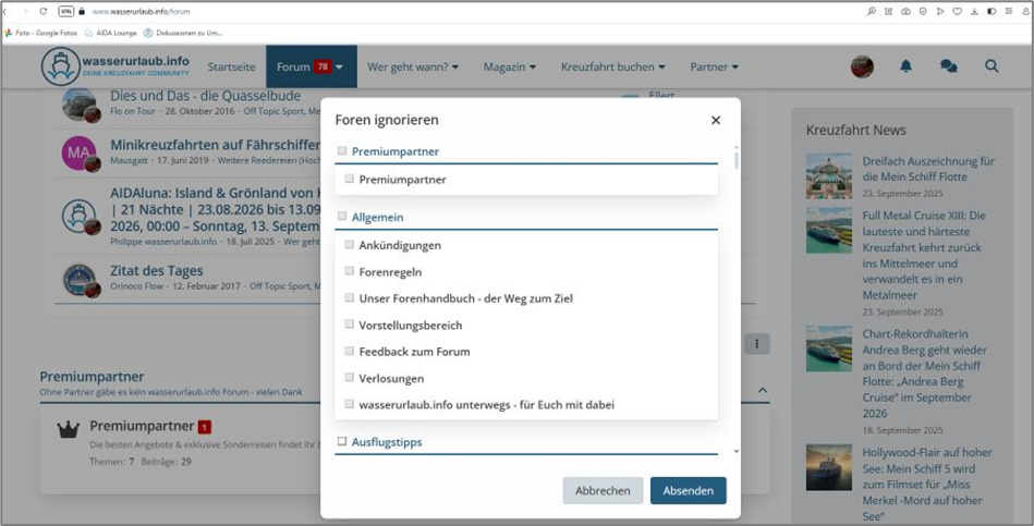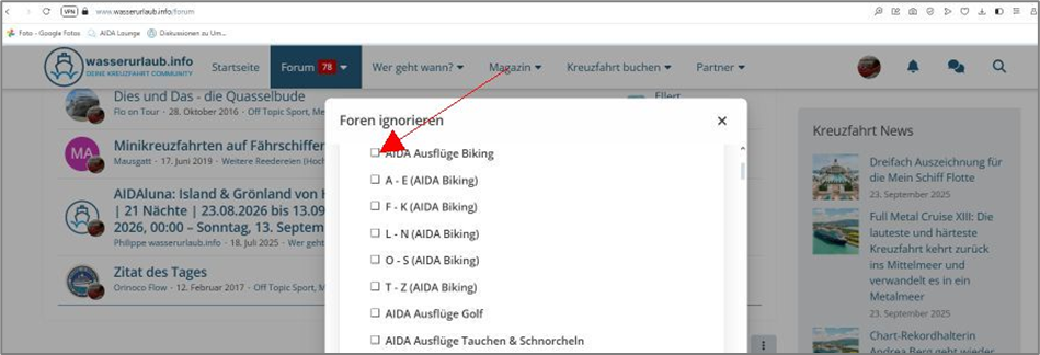 Natürlich ist das Auswahlfeld „Foren ignorieren“ auf den ersten Blick etwas irritierend. Doch keine Sorge – man ignoriert nicht automatisch das komplette Wasserurlaub-Forum, wenn man dieses Feld durch einen Klick mit der Maustaste auswählt.