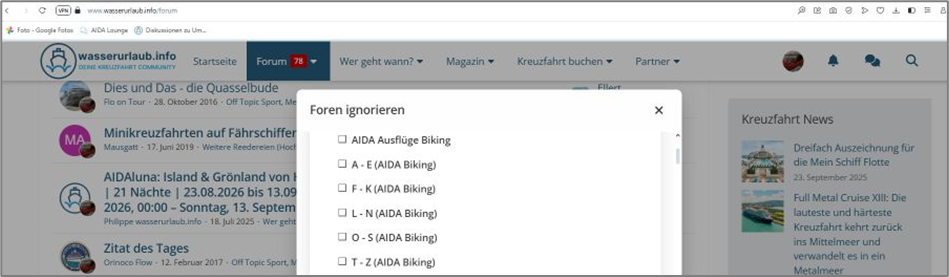 Möchte man zum Beispiel Fäden zum Thema „AIDA Ausflüge Biking“ ausblenden, um hierzu keinerlei Informationen im Forum angezeigt zu bekommen …