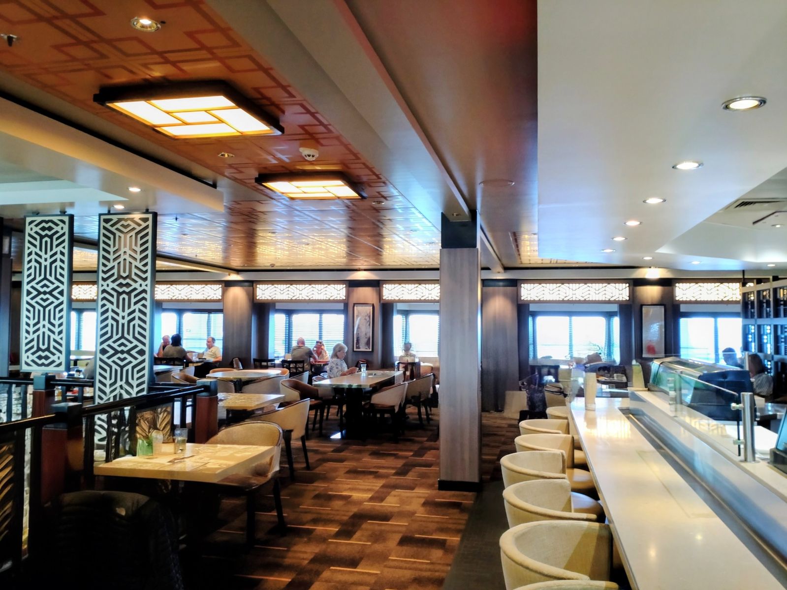 Sehr positiv, dass man wie bei Mein Schiff ohne Reservierung jederzeit kommen kann. Es gab für uns, auch in größerer Gruppe, immer einen Platz. Das Essen war hier wirklich gut, der Service schnell, man war in ca. 1 Stunde mit dem Abendessen durch und die Atmosphäre war sehr ruhig und angenehm. Einzig die Auswahl an vegetarischem Essen hätte größer sein können.