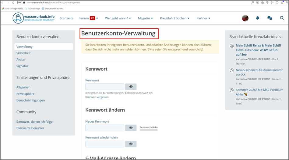 Unter dem Punkt „Avatar“ befindet sich der Punkt „Signatur“. Hier kann das Mitglied eine eigene Signatur vergeben. Das kann ein Zitat sein oder auch die Angabe der nächsten geplanten Kreuzfahrt: