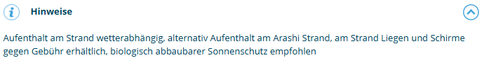 Liegen und Schirme sind vor Ort gegen Gebühr, ohne Reiseleiter, Vielzahl von Bars und Restaurants vor Ort, nicht empfohlen für mobilitätseingeschränkte Gäste, Mitnahme von Handtuch, Geld und Sonnenschutz empfohlen