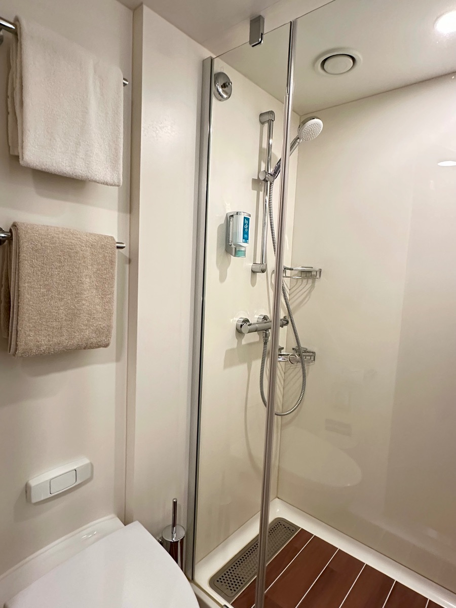 Das Bad habe ich etwas kleiner empfunden, als auf anderen Schiffen (Sphinx-Klasse und Veranda-Kabinen auf der Perla).