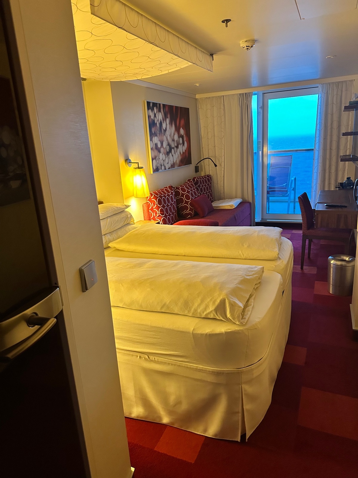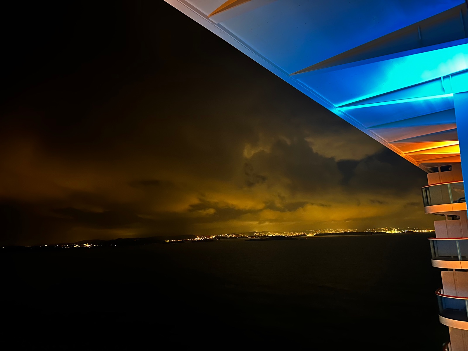 Der Dachüberstand von Deck 16 stört nicht. Allerdings ist ein Fallrohr auf dem Balkon. Das kann schon einmal leise glucksen. Auch befindet sich eine beleuchtete Säule auf dem Balkon und auch der Überstand wird nachts beleuchtet.
