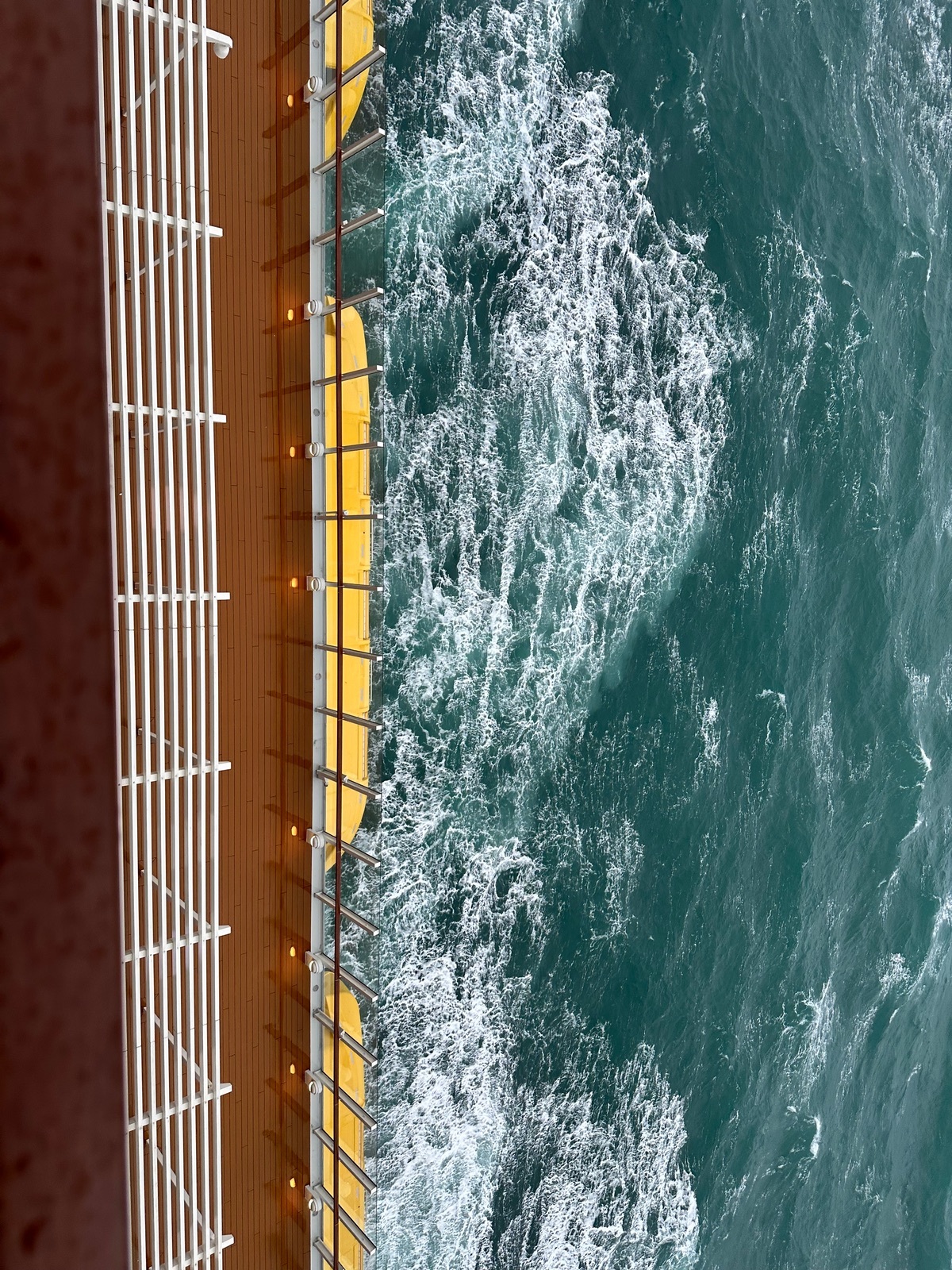 Der Dachüberstand von Deck 16 stört nicht. Allerdings ist ein Fallrohr auf dem Balkon. Das kann schon einmal leise glucksen. Auch befindet sich eine beleuchtete Säule auf dem Balkon und auch der Überstand wird nachts beleuchtet.
