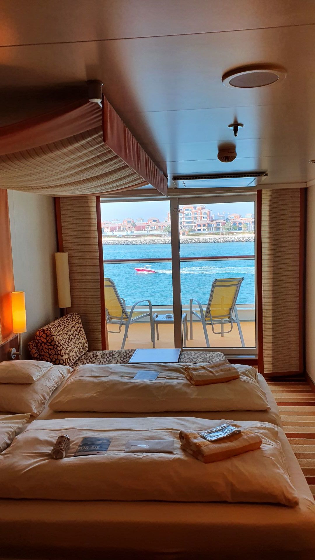 Die Kabine liegt Steuerbord und ist super nah am hinteren Treppenhaus gelegen. Man ist schnell in den Restaurants, oder auf dem Außendeck auf Deck 5. Die Kabine verfügt über einen schönen großen Balkon. Einzig die Klimaanlage schien uns ziemlich kalt und war etwas lauter, auch bei geöffneter Balkontüre.
