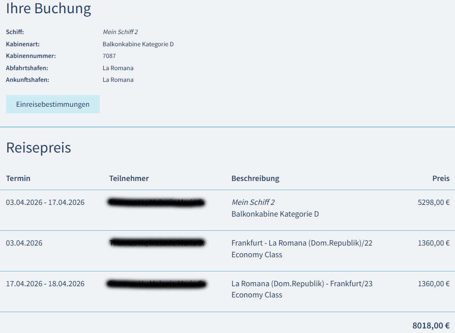 Aus gesundheitlichen Gründen können wir unsere geplante Karibikkreuzfahrt nicht wahrnehmen. Wir bieten daher diese Reise an, welche aufgrund hoher Nachfrage so bei TUI Cruises/Mein Schiff nicht mehr verfügbar ist.