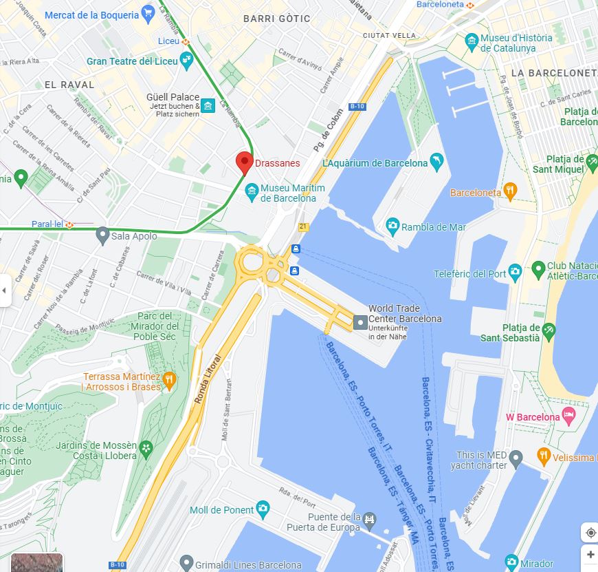 De Metrobahnhof nahe des Hafens heißt Drassanes. Der Eingang befindet sich am Anfang der Ramblas auf der linken Seite