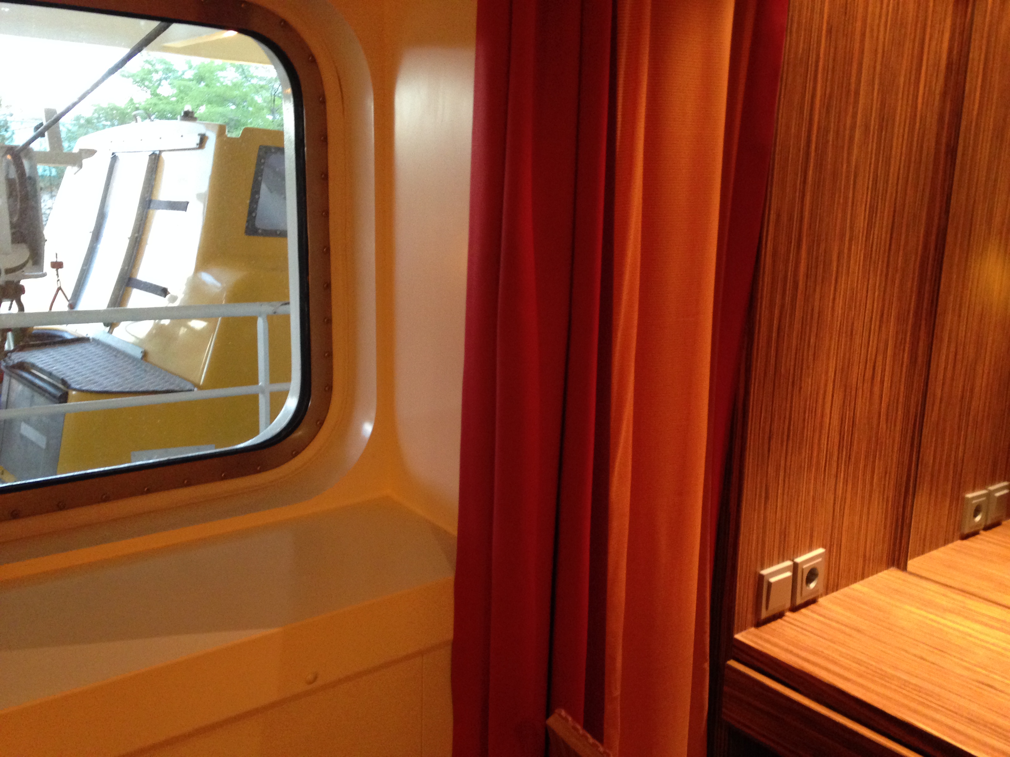 Das Bett steht quer zur Fahrtrichtung und durchs Fenster kann man durchaus zwischen den Rettungsbooten durchschauen.