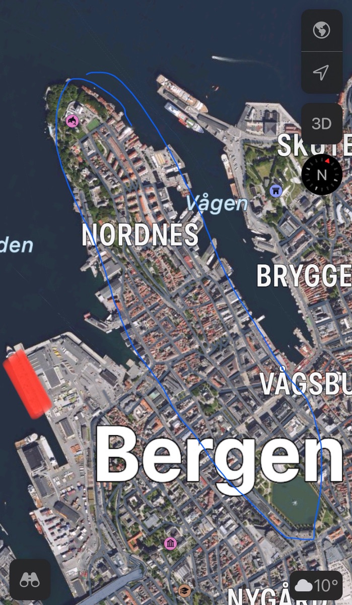 Die Mädels haben bei unserem Besuch in Bergen dieses blau markierte Stadtviertel, was quasi direkt am Anlieger der PRIMA (roter Balken