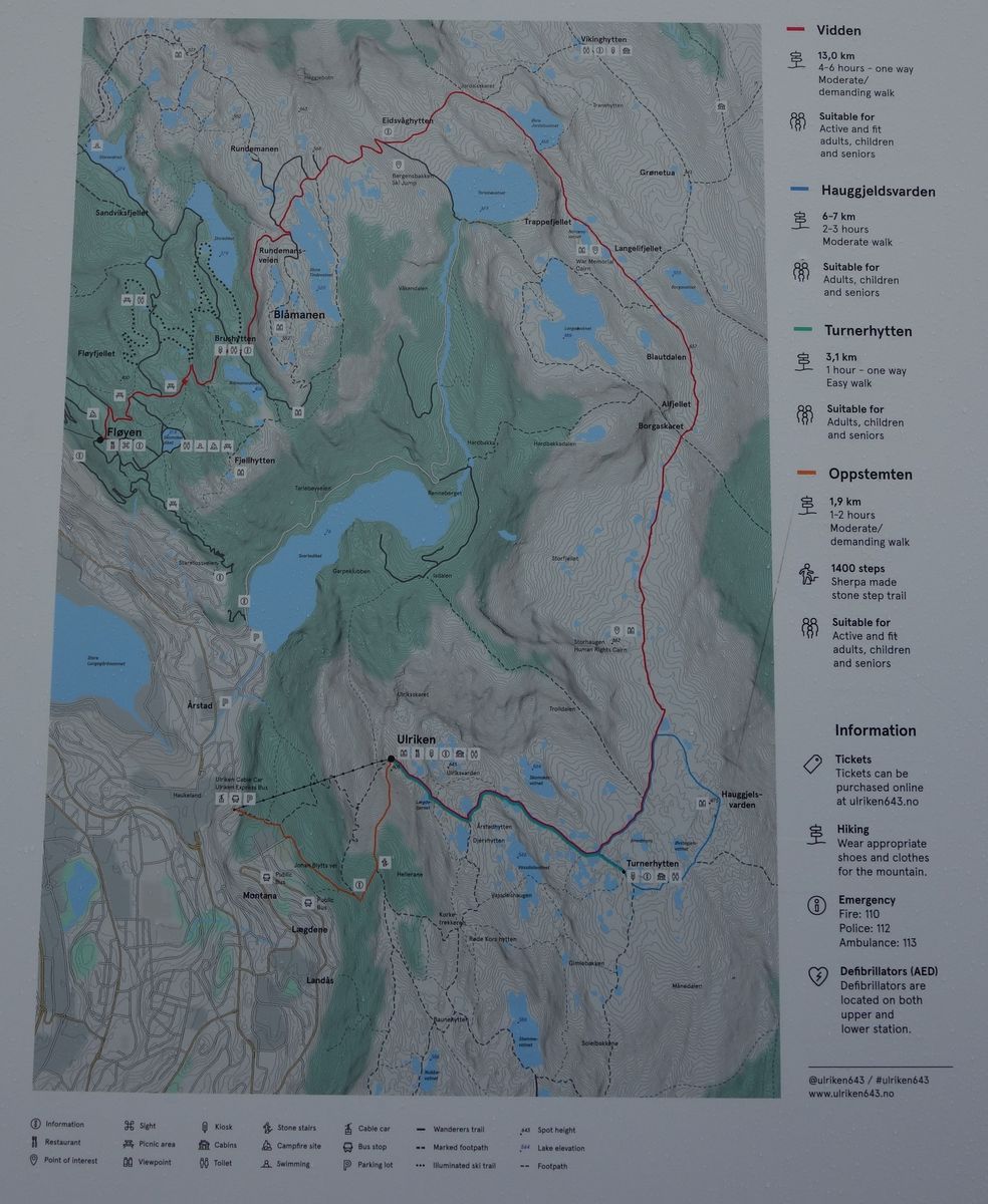 Es gibt scheinbar auch einen Wanderweg über beide Berge, dann kann man mit der einen Bahn auf den Floyen und von da auf den Ulriken und da mit der anderen Bahn runter fahren oder andersrum. Habe es nicht so genau verfolgt, weil es für die Tour mit unserer Familie nicht interessant war. Meine ich hätte was von 3h wandern gelesen