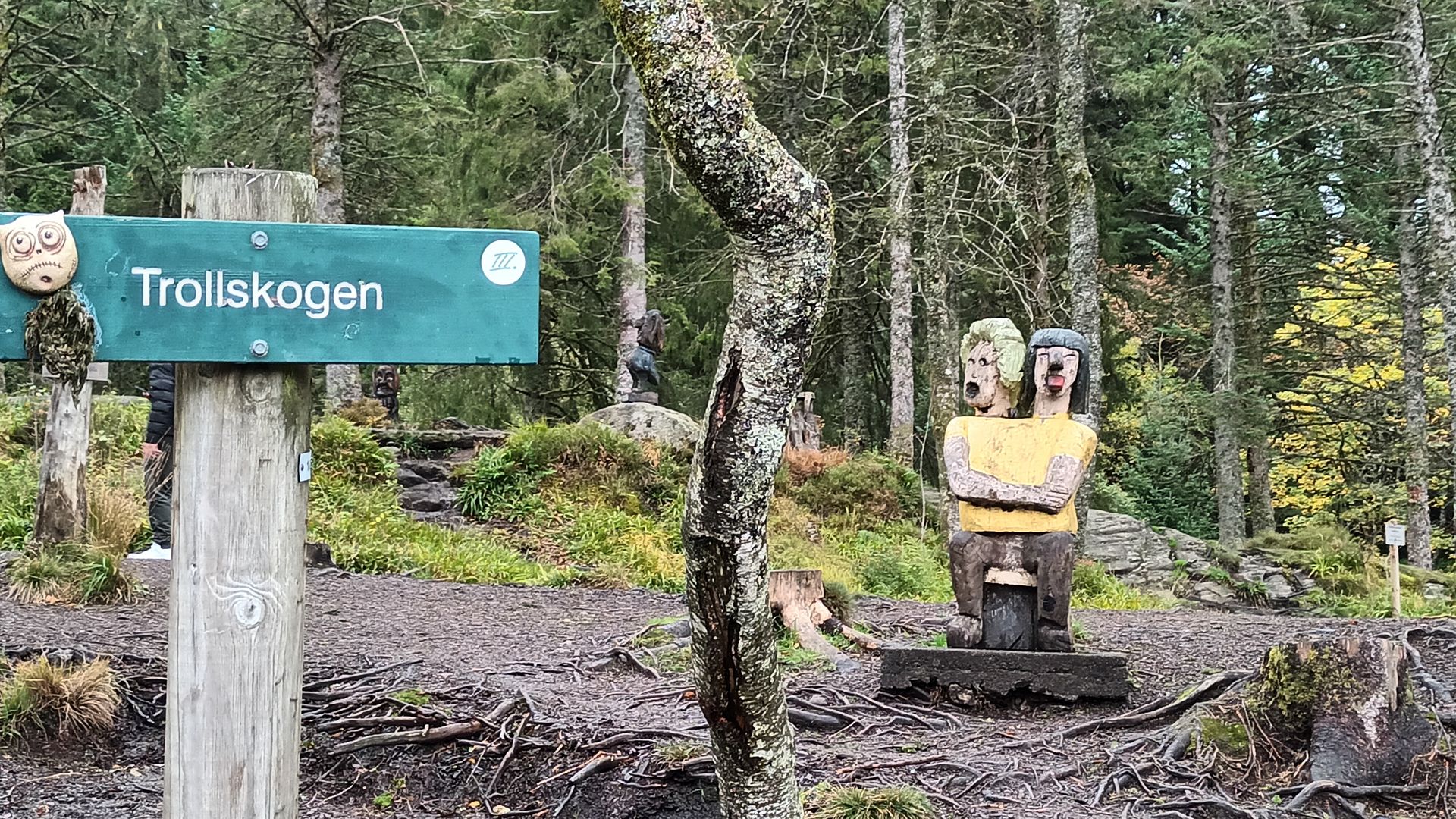 Dieser Wegweiser befindet sich ein Stück abseits der auf dem Plateau befindlichen Gebäude. Er führt hinter dem Gebäude unterhalb des "Trollwalds" entlang, in dem sich die Toiletten befinden. Dort ein Stück entlanggehen und man stößt auf diesen Wegweiser und eben diese Weggabelung.