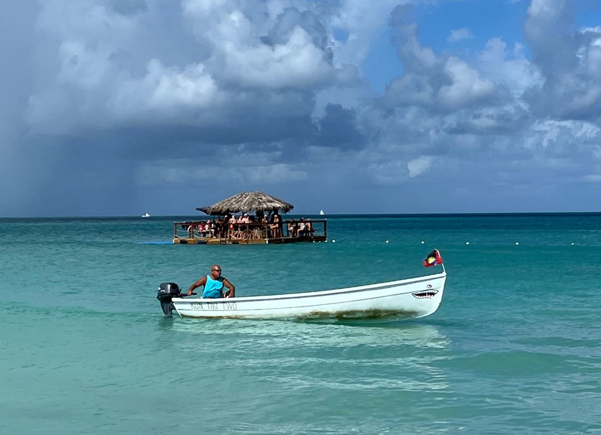 Auf Antigua fuhren wir per Taxi für 5 USD pro Person zur Dickenson Bay mit der berühmten roten Telefonzelle. Es war unserer Meinung nach der schönste Strand auf der Reise. Für 20 USD gab es zwei Liegen und einen Schirm. Zudem fuhren wir per Boot zur Kon Tiki Bar.