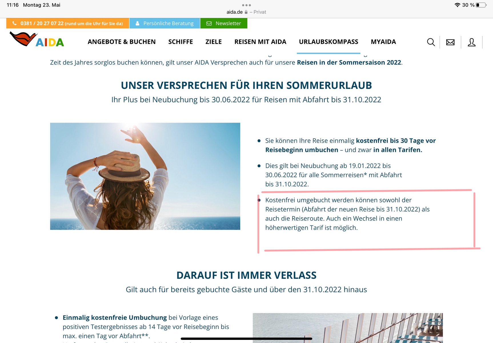 Ich kann immer über die Hotline umbuchen, also Kabine oder all in dazu, auch wenn meine Buchung übers Reisebüro läuft.