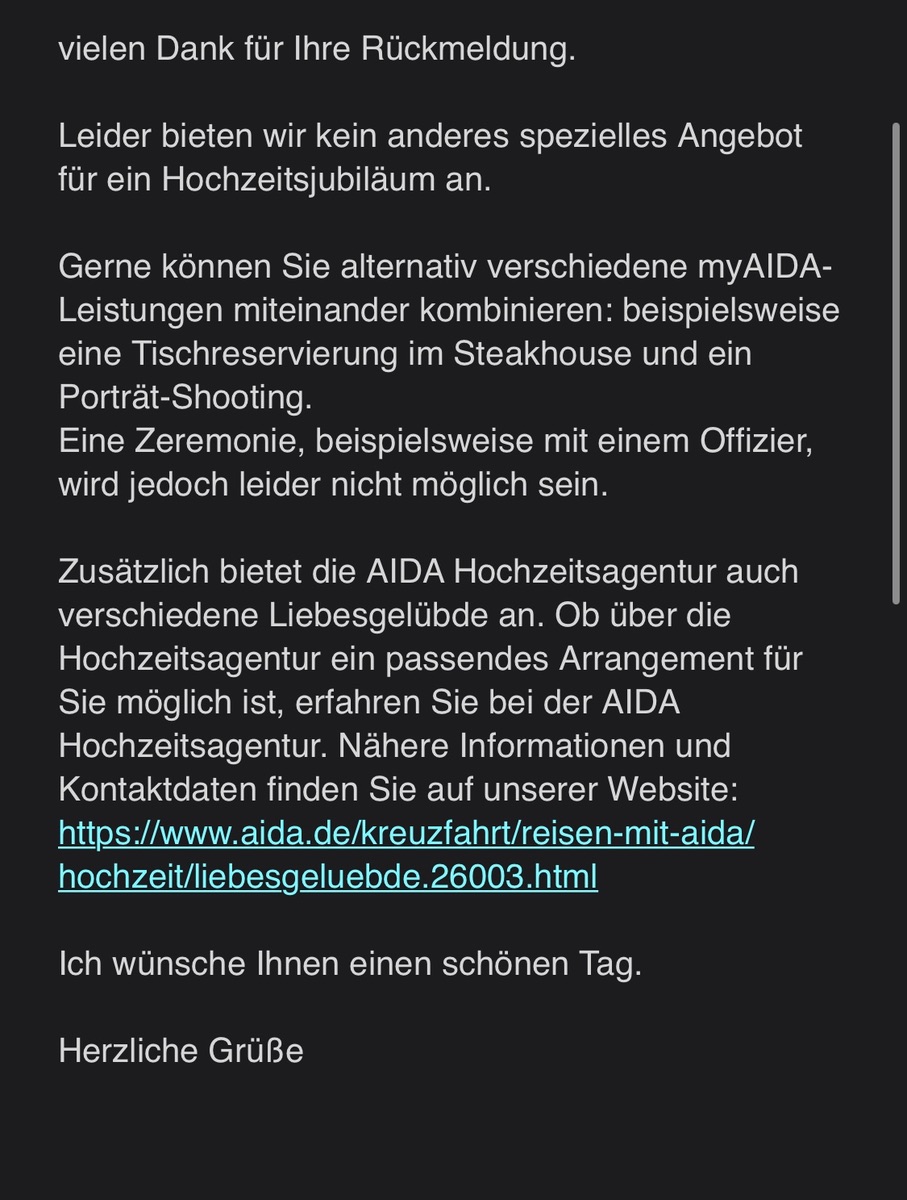 AIDA gestalten wir uns. Mal abgesehen davon, kann ich aktuell unter My AIDA kein Hochzeitspakt buchen. Lediglich Zum Geburtstag, Silberne- o. Goldene Hochzeit oder zur Verlobung.