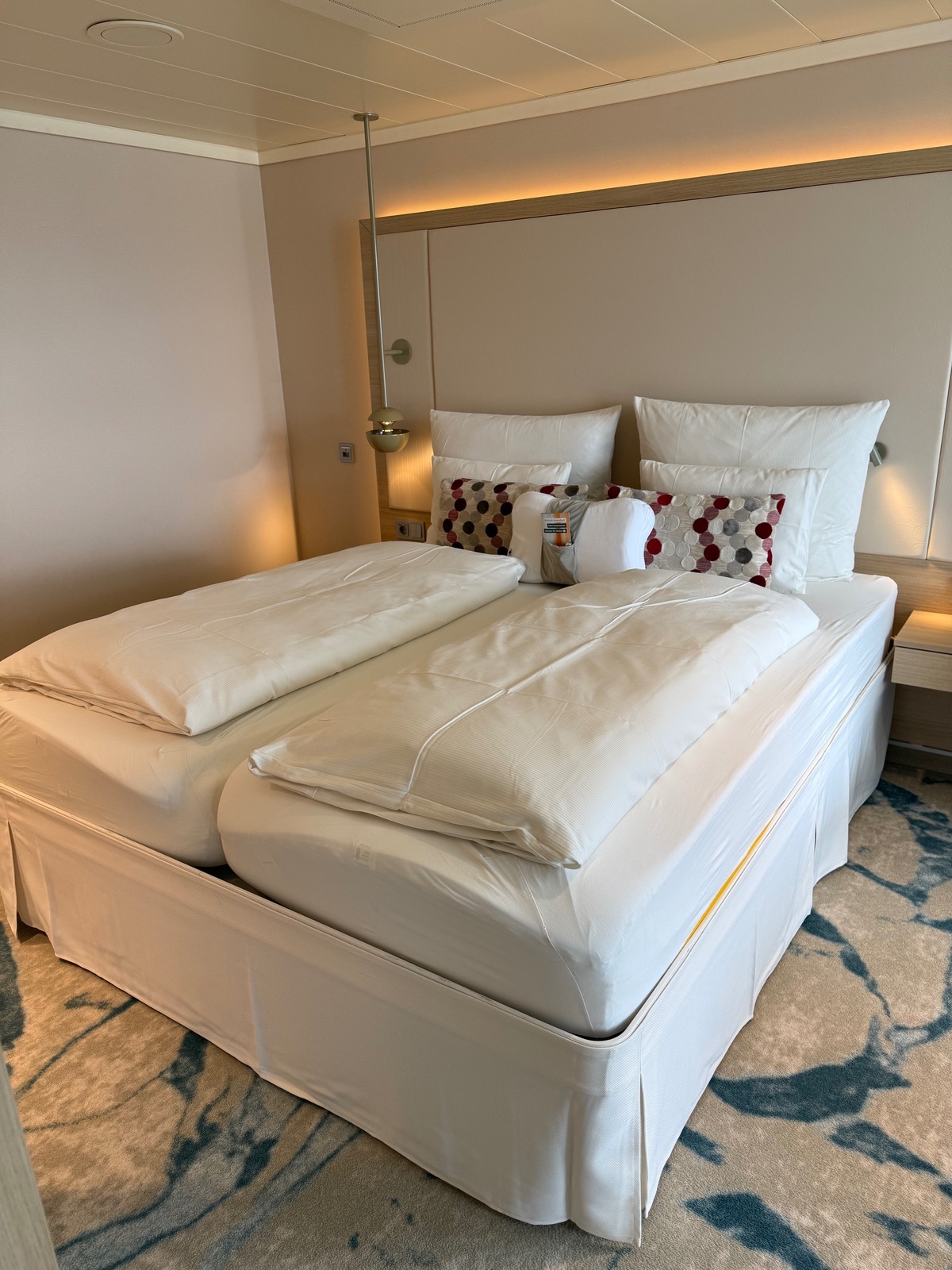 In der Kabine sind scheinbar alle Wände neu foliert worden. Alles ist sehr schön hell und freundlich und sah wirklich noch wie neu aus. Nicht gefallen hat uns, dass im Schlafzimmer offenbar das Bett um 90 Grad gedreht wurde, so dass man aus dem Bett nicht mehr geradeaus auf das Meer schauen kann. Das hat sicher mit der Platzierung des großen neuen TV zu tun, der für unseren Geschmack in beiden Räumen zu groß geraten ist. Im Schlafzimmer fehlten uns auch Ablagemöglichkeiten oder Haken für Kleidung, so dass wir unsere Sachen auch hier wieder zum Lüften an die Abdeckung der Klimaanlage gehangen haben 🤦🏻‍♀️. Platz wäre genug im Schlafzimmer vorhanden. Außer dem Bett und den Nachtschränkchen steht nur noch ein kleiner Tisch und ein Sessel darin. Unter dem TV hätte auch noch eine kleine Kommode oder ein kleines Regal Platz gehabt. Die Nachtbeleuchtung im Bad und unter den Nachtschränkchen fanden wir sehr gelungen und überhaupt nicht störend Eine absolute Fehlkonstruktion sind hingegen die beiden kleinen Leselampen, die am Kopfteil des Bettes so weit innen platziert wurden, dass man sich im Sitzen fast zwangsläufig daran stößt.