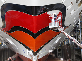 Von Mundwinkel zu Mundwinkel misst der rote Kussmund von AIDAblu ganze 21 Meter und ist damit der größte aller AIDA Schiffe. Die Handwerker des Malerbetriebs Albers aus Aschendorf brachten die einzelnen Elemente der Außenbemalung in einem Schablonenverfahren auf den Bug auf. Die verwendeten Farben sind hochwertige High Gloss Farben, die einen optimalen Glanz und lange Haltbarkeit versprechen.