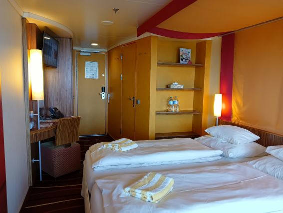 Wenn man die Kabine betritt, führt die Tür linkerhand ins Bad, rechts befindet sich ein dreitüriger Schrank (mit jeder Menge Kleiderbügel). Angrenzend an den Schrank kommt der kleine „Schreibtisch“ mit Spiegel, Stuhl, Föhn in der Schublade, Telefon und darüber ein Spiegel und der Fernseher.