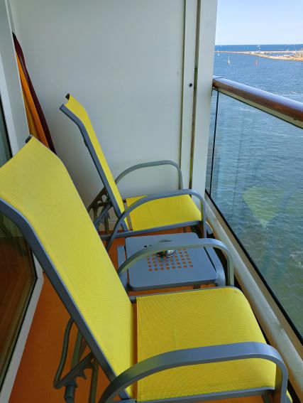 Auf dem Balkon mit Glasbrüstung wie üblich 2 Stühle, ein Tisch und eine Hängematte. Die Farben der Kabine sind überwiegend in einem angenehmen Rot und Beige gehalten. Auch große Koffer können bequem unter den Betten verstaut werden.