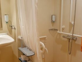 Das Bad ist ebenfalls ziemlich groß; neben der Toilette sind die Haltegriffe die aber hochklappbar sind.