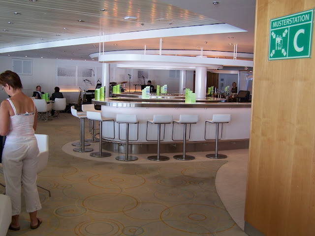 Die Mitfahrer stehen einmal um das ganze Gebäude herum und im geschickt geführten Zickzack vor den Schaltern. Es erinnert ein wenig an Disneyland. Die Wartezeit beträgt über 2 Stunden, zwischendurch werden unverständliche Durchsagen gemacht, die nicht einmal die Mitarbeitern von TUI-Cruises verstehen. Der Schweinegrippebogen wird vor den Schaltern eingesehen. Wir haben die Kreuze an den richtigen Stellen gesetzt und können passieren. Allerdings will auch niemand den Bogen haben, also ab in den Rundordner. Die restliche Prozedere ist bekannt, es werden Fotos gemacht und die Kreditkarte eingelesen.