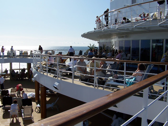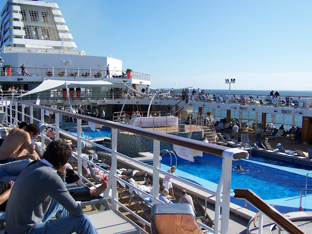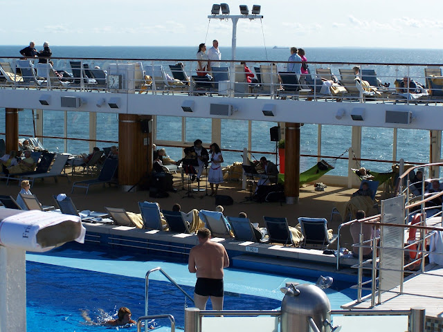 Die Poollandschaft sieht quadratisch, praktisch, nett aus. Der Pool ist groß genug zum Schwimmen, wir benutzen ihn aber nicht. Das Deck ist in zwei Ebenen unterteilt, eine spanische Band spielt dezente Musik. So können wir es auch aushalten.
