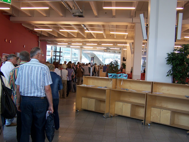 Wir reisen mit öffentlichen Verkehrsmitteln an. Die Koffer geben wir bereits am Kieler Hauptbahnhof in die Obhut von TUI-Cruises. Die Wartezeit beträgt hier etwa 15 Minuten und ist daher nicht beängstigend. Wir bekommen an dieser Stelle direkt einen Fragebogen zur Schweinegrippe ausgehändigt, der auch von jedem Passagier unterschrieben werden musste. Vom Hauptbahnhof gehen wir zu Fuß zum Kreuzfahrerterminal. Wir bewältigen diesen Weg in etwa 20 Minuten. Es ist jetzt 14.30 Uhr. In das Terminal kommen wir gar nicht hinein, da die Schlange vor dem Checkinschaltern schon weit nach draußen reicht.