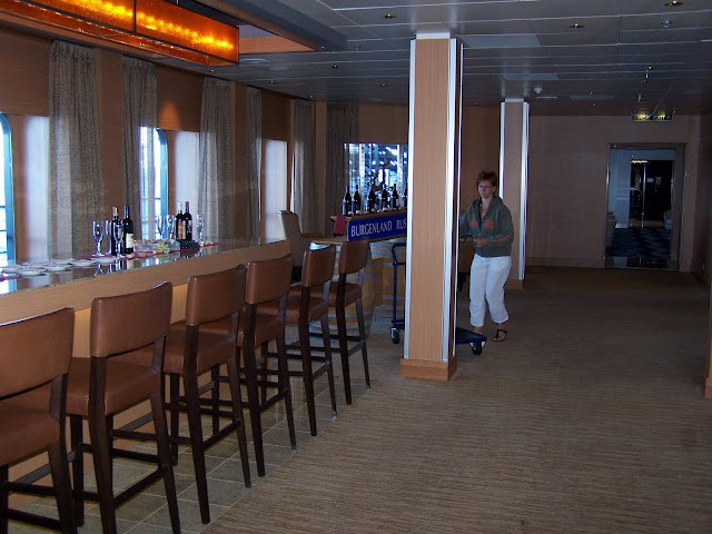 Ankelmannsplatz heißt das Buffetrestaurant auf Deck 11. Etwas steril gehalten, aber mit schönen Sitzecken an den Fenstern. Wenn man dort einen Platz bekommt ist die Aussicht schön. Alle Getränke werden, an Automaten an den Stirnseiten des Restaurants, selbst gezapft. Es gibt absolut nichts auf den Tischen, außer den bekannten Besteckständern. Das Essen ist gut, am besten gefällt uns die Wok-Station. Hier kann man sich Fleisch, Nudeln, Garnelen, Gemüse usw. auffüllen, es wird zum Koch gereicht, der gibt einem eine Wartenummer und nach ca. 3-5 Minuten ist das Gericht im Wok zubereitet und fertig. Den Rest im Restaurant können wir gar nicht so ausprobieren. Am ersten Morgen ist es im Ankelmannsplatz wie auf dem Bahnhof und wir wechseln das Lokal. Der zweite Morgen verläuft hier äußerst ruhig. Das Frühstück ist hier auch gut und am besten gefällt uns die Omelettestation.